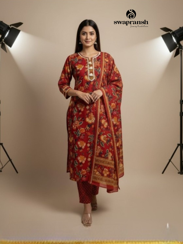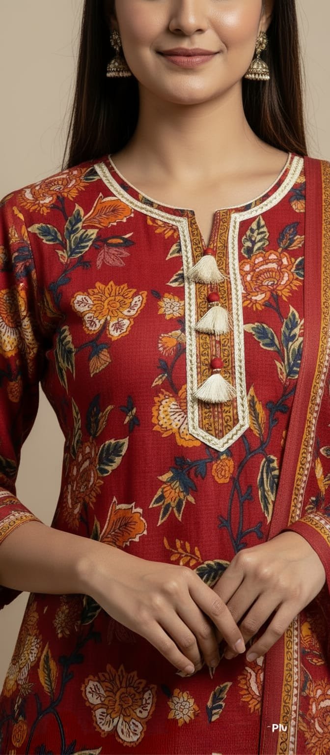 Add a touch of grace to your ethnic collection with this maroon floral printed cotton kurta set. Designed with intricate floral motifs, delicate tassel detailing on the neckline, and a beautifully coordinated dupatta, this outfit is perfect for festive occasions, casual gatherings, or everyday elegance. Pair it with statement earrings and heels to complete the look.