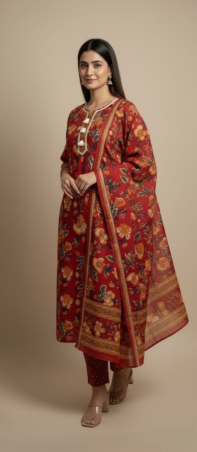 • Style: Straight Kurta with Matching Pants & Printed Dupatta