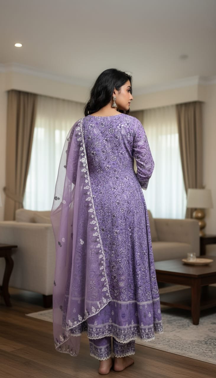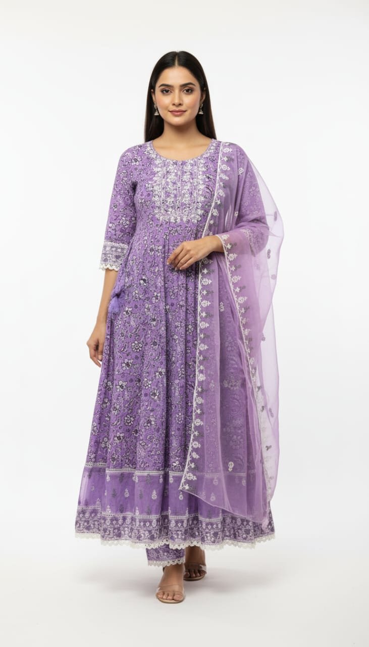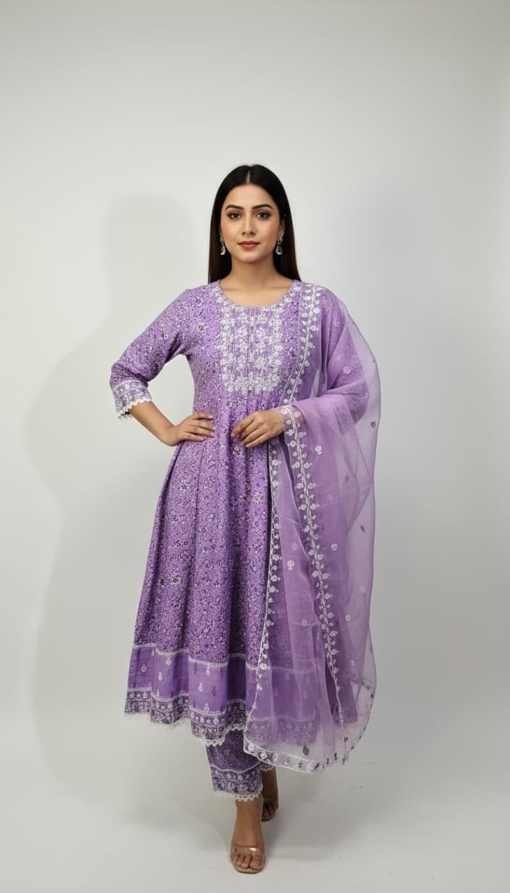 purple elegant blue cotton kurta set with printed pants & dupatta. Soft breathable fabric, perfect for office, festive & daily wear.