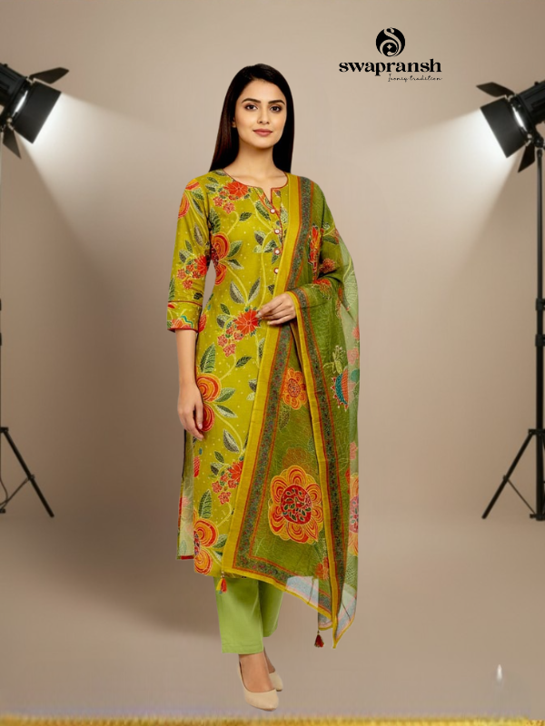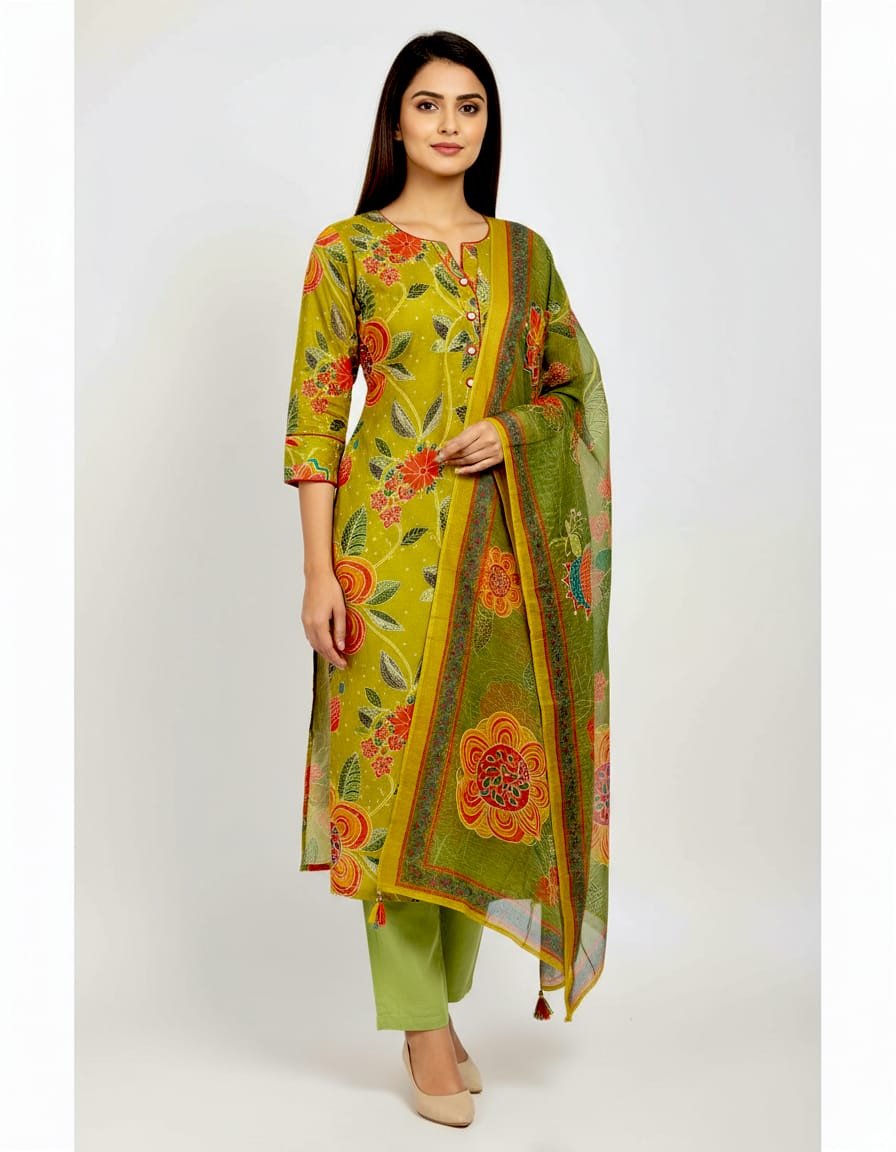 Add a touch of elegance to your ethnic wardrobe with this beautiful 3-piece cotton kurta set. The outfit features a vibrant green base with bold floral prints in red, orange, and teal, paired with matching solid pants and a printed dupatta. Designed for all-day comfort, this set is perfect for casual outings, office wear, or festive gatherings.